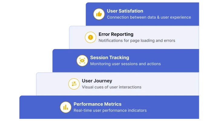 UX observability must go beyond infrastructure and server traces. It needs to capture what users actually see and do: how fast content loads, how smooth the interface feels, and where errors interrupt the journey. This perspective is powered by performance monitoring, real user sessions, and user journey tracking, all designed to reflect the quality of the user’s experience.